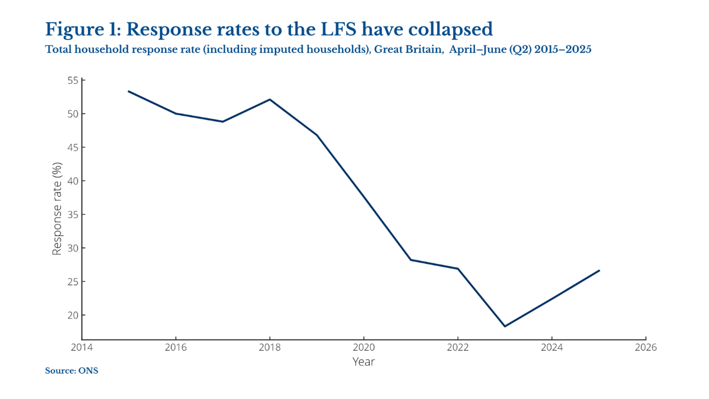 The Labour Force Survey (LFS) sits at the centre of the ONS’s problems. As the Government’s key measure of employment and a critical input for the OBR’s forecasts, its reliability is vital. Yet during the pandemic, cracks widened into a full-blown collapse. Changes to the way the survey was conducted forced its withdrawal, revealing several weaknesses — two of them particularly damaging.