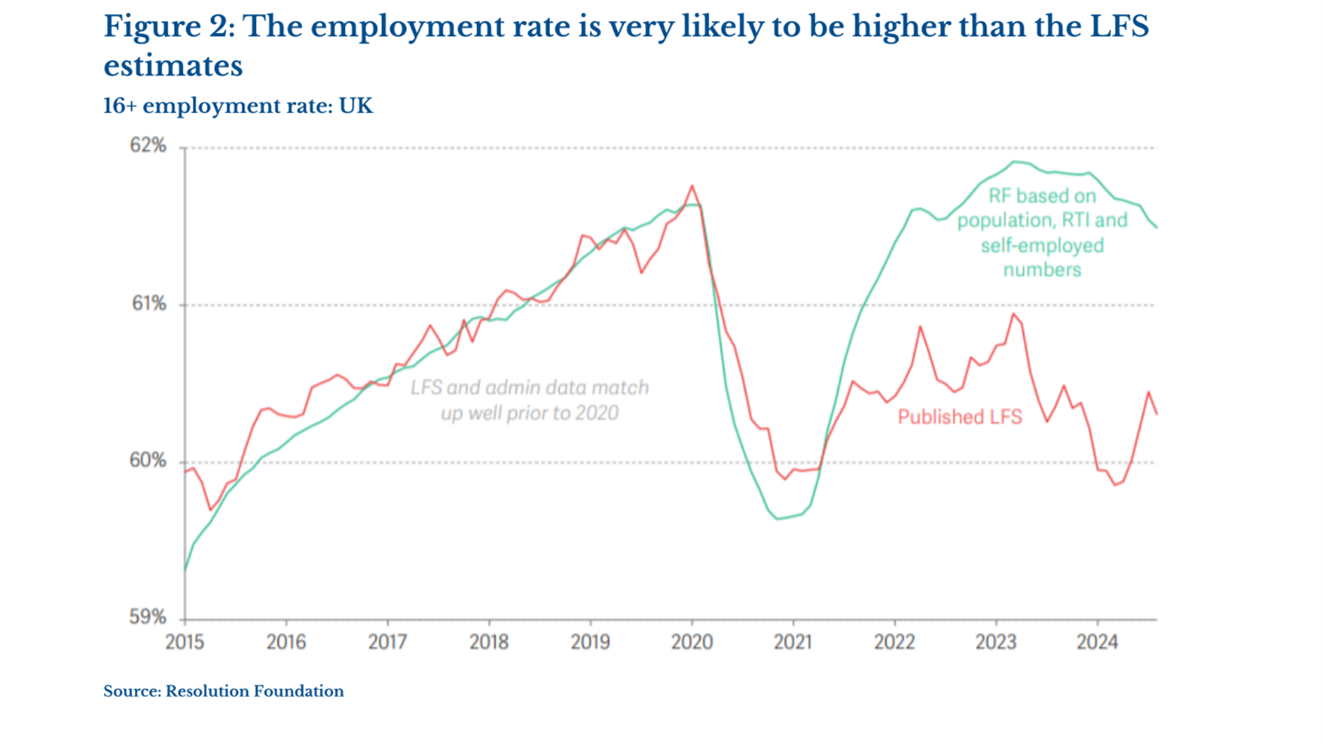 As Figure 2 demonstrates, calculating the employment rate using HMRC admin data shows a sharp divergence with the LFS after 2020. While the two had tracked closely before, the Resolution Foundation contends LFS increasingly captured those more often at home — overstating inactivity by around 930,000 workers.