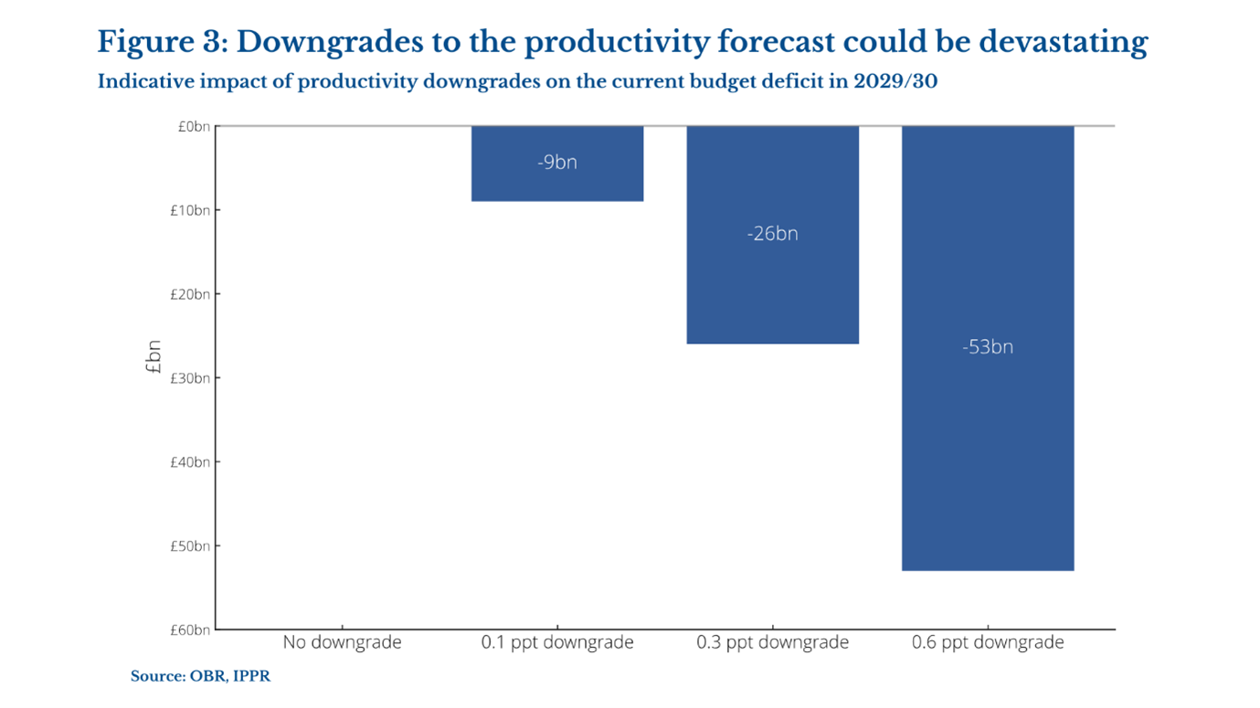 Fluctuating forecasts have the ability to derail the Government’s fiscal planning. A mere 0.1 percent downgrade in the forecasted rate of productivity costs the Government £9bn against their fiscal rules — equal to the entirety of the Government’s ‘headroom.’